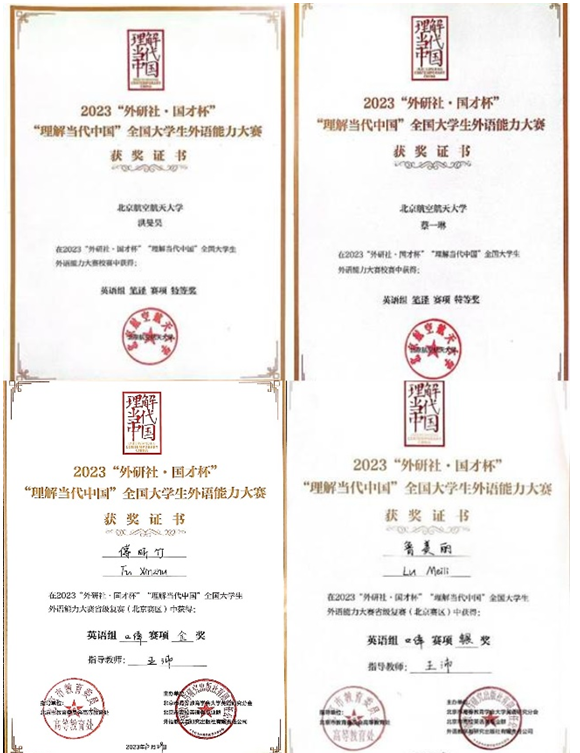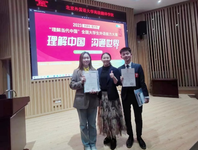 近日,我校澳门十大网投平台排行2020级英语专业本科生蔡一琳和2023级翻译专业硕士研究生(MTI)洪旻昊获得2023“外研社·国才杯”“理解当代中国”笔译北京赛区金奖,指导教师为翻译系王晨爽和顿超老师;2020级翻译专业本科生傅昕竹和2022级文学专业硕士研究生鲁美丽分别获得2023“外研社·国才杯” “理解当代中国”口译北京赛区金奖与银奖,指导教师为翻译系郑薇和王沛老师。