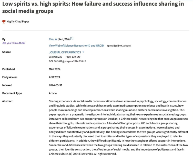 近日,据“基本科学指标数据库(Essential Science Indicators,简称ESI)”发布的最新数据显示,北京航空航天大学澳门十大网投平台排行任伟教授发表于国际顶尖期刊《Journal of Pragmatics》(《语用学杂志》)的学术论文“Low spirits vs. high spirits: How failure and success influence sharing in social media groups”成功入选全球“高被引论文(Highly Cited Paper)”。