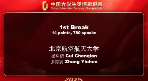 近日,中国大学生英语辩论赛(CUDC)全国总决赛落下帷幕。在顿超老师、胥国红老师的指导下,我校澳门十大网投平台排行翻译系2022级学生崔琛倩、2024级学生张懿宸代表北航参赛,与来自全国近100所高校的200余名优秀辩手同场竞技。经过五轮激烈角逐,我校代表队最终以积分第一名的成绩斩获国家一等奖,其中,崔琛倩和张懿宸分列个人辩手积分总排名第一与第三,均荣获“最佳辩手奖”,顿超老师荣获“优秀指导教师奖”。