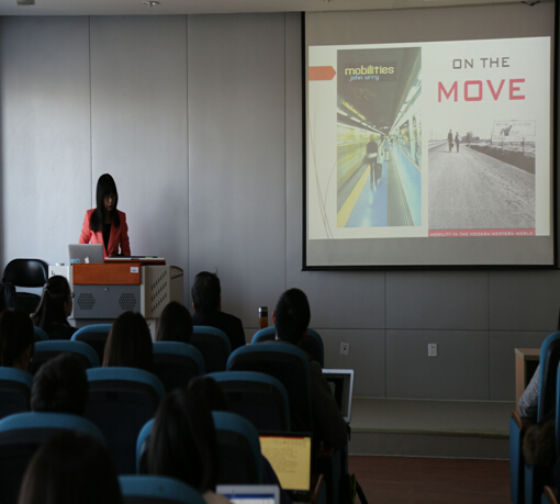 刘英教授首先从西方的文化地理学图谱开始,阐释了约翰·厄里、安东尼·吉登斯、道林·玛西等人关于“流动性”的定义,并将“流动性”引入美国文学研究,认为流动性是美国性的重要组成部分。刘英教授的报告聚焦美国文学19世纪50年代至20世纪40年代之间的流动性研究,以跨学科的视角,从空间地理、人文、政治等角度深入探讨美国文学与流动性的关系,探讨以火车和汽车作为主要交通工具的载体在美国文学中的表征。刘英教授的讲座以自己申报国家社科基金的视角进行,对研究对象选择、研究对象界定、研究范围划定、研究方法展开进行层层剥离,有序展开。这样的视角,对于青年教师和广大博士/硕士研究生从事学位论文开题和写作也具有重要的启示意义。讲座之后,外语学院师生就刘英教授的讲座提出了自己的问题,刘英教授知识渊博,旁征博引,对师生们的问题进行了认真严谨的回答,现场气氛热烈。