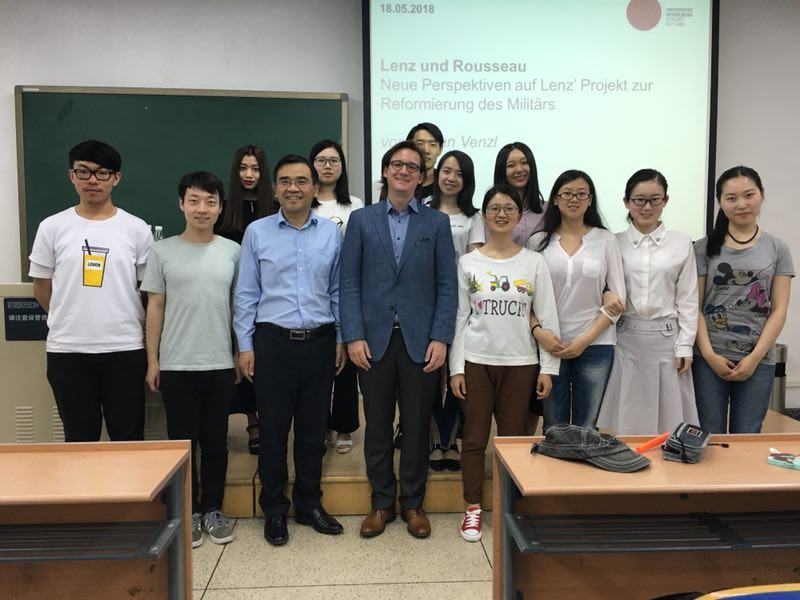 在周五的讲座中,Venzl博士在讲述社会背景中让大家了解,18世纪军事不仅在人们的日常生活,同时也在文学作品尤其是戏剧中占有极其重要的地位。那么另一个问题也自然备受关注,究竟军人能否结婚,针对军人的生活应该实行怎样的制度使其与社会更加和谐共存。当时很多人都思考过这个问题并提出自己的设想。法国著名哲学家卢梭认为,一个人单独生存时本性是向善的,但是多人一起共处形成的社会便使原来积极的“自爱”在相互竞争中转变为消极的“利己”。怎样避免这样的变化,卢梭在1762年的《社会契约论》中提出自己的看法。而伦茨通过《士兵》同样也说明社会中每个人都自私自利,只站在自己的立场思考问题,却根本没有觉察到整个社会制度的错误,同时他也针对性地提出解决方案。通过对比两人具体观点,Venzl博士最后向大家证明伦茨在很多方面借鉴了卢梭的思想。
