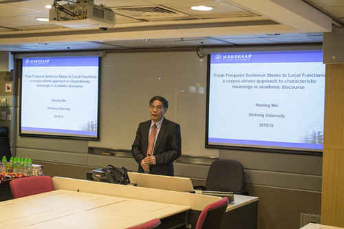 2015年10月15日,我院卫乃兴教授应邀赴香港城市大学翻译与语言学系做学术报告,题目为From Frequent Sentence Stems to Local Functions: a corpus-driven approach to characteristic meanings in academic discourse。该研究对功能句干(Functional Sentence Stem)概念作了清晰的界定,利用新的MI值计算方法(Wei & Li 2013),从JDEST语料库中提取了大量的功能句干,对其结构特征和知识构造、评价和谋篇等局部功能(local function)做了详尽的描写。这些研究发现对于学术话语分析和ESP教学具有重要的指导意义,紧跟国际语料库语言学的前沿研究,得到了香港城市大学翻译与语言学系同行和学生的一致好评。