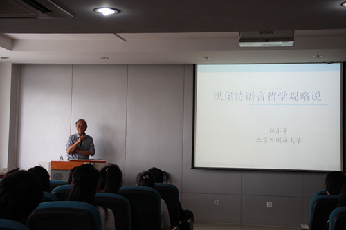 北京外国语大学姚小平教授应邀来到外语学院,为外院师生带来了题为“洪堡特语言哲学思想述略”的精彩讲座。姚教授以ppt的形式为大家展现了洪堡特的家庭背景,学术经历,在语言学哲学发展中的重要地位等。讲座对洪堡特的重要思想贡献进行了回顾,对洪堡特在不同国家的生活学习经历与其学术思想的关系进行了分析,对他在普通语言学和语言哲学等方面的奠基作用进行了评述,对外界对洪堡特思想的误解和洪堡特思想存在的时代局限性进行了解读。讲座中提及的洪堡特大学及马克思关于哲学和思想的主张给人的印象尤为深刻,“学习语言学哲学并不应只是为了解释语言社会规律,更是为了更好地改造社会。”此外,姚教授还对当今国内洪堡特思想的研究情况以及相关的文献书籍进行了推荐和点评,之后姚教授回答了外语学院师生关于洪堡特思想和语言类型学相关问题。姚教授生动的演讲给外语学院师生带来了一场思想的盛宴,讲座结束前向明友院长对姚教授讲座的内容做了总结回顾,鼓励大家把努力学习,将来成为洪堡特一样有思想的学者。