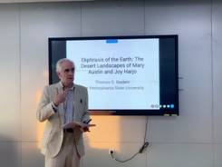6月11日19:00-20:30,Beebee教授为我院师生做了第二场讲座,主题为“Ekphrasis of the Earth”(大地的画诗)。Beebee教授首先介绍了“画诗”一词的由来和定义。他认为“画诗”是文学与艺术之间中介的原始形式,荷马《伊利亚特》中对阿喀琉斯之盾的著名描述即是如此。然而,当描述的对象是风景或地球时,它们本身被认为既有故事可讲,又有塑造叙事和语言的力量和资源,那么会出现什么样的文本性呢?通过对文本片段的比较和解读,Beebee教授指出是“画诗”塑造了美国西南部沙漠中的三个文本:玛丽·奥斯汀的《少雨之地》(1903年);乔伊·哈乔/史蒂芬·斯特罗姆的《世界中心的秘密》(1989年);尼科尔·布罗萨德的《斯穆夫沙漠》(1987年)。这三部作品中的人名和动物名也体现出“画诗”的特点,是微缩的故事和风景画,例如:Round Rock, Rose Sand等。不同的风景有不同的历史并产生不同的故事,形态各异的景观线“landscape line”纵横交织形成了“画诗”般的文学作品。