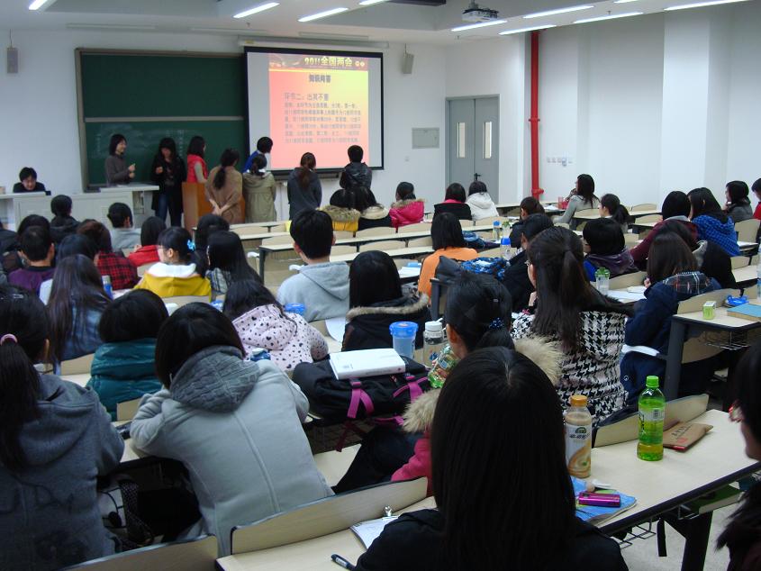 研讨会共分三部分,首先进行的是“知识问答”环节,主持人以小班为单位,每班各抽取了一名代表,参加比赛,现场气氛也迅速活跃起来,台上的选手认真思考,台下的同学也相互讨论,好不热闹。在经过“出其不意”,加时赛等环节的紧张竞赛后,来自13班的武玉坤同学获得了冠军。这次竞赛不仅考察了同学们对两会的了解情况,更以活泼生动的方式丰富了大家两会的基本知识。会议的第二部分中,为了加深同学们对两会的认识,主持人播放了媒体对两会解读的视频,在从政府工作报告的解读中了解到,住房,教育,医改,养老保险改革等方面仍然是政府工作的重点内容。在会议最后一部分,“同学话两会”里,各小班代表依次进行了发言,她们从当代大学生角度出发,发表了各自对社会民生如房价教育等具体问题发表的看法,也提到目前社会压力越来越大,更应该抓紧现在的时间,迎接不远的挑战。会议最后,预备党员,党校小班长,大班团支书朱晓枫进行了总结发言。